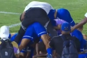 赛后,库拉索球员激情庆祝,替补球员冲入场地,有些球员直接趴在地上。