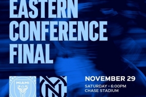 纽约城社媒晒出海报,预热对阵迈阿密国际的比赛,开球时间为11月29日18点(北京时间11月30日7点),比赛地点为迈阿密国际主场拉克哈特体育场。